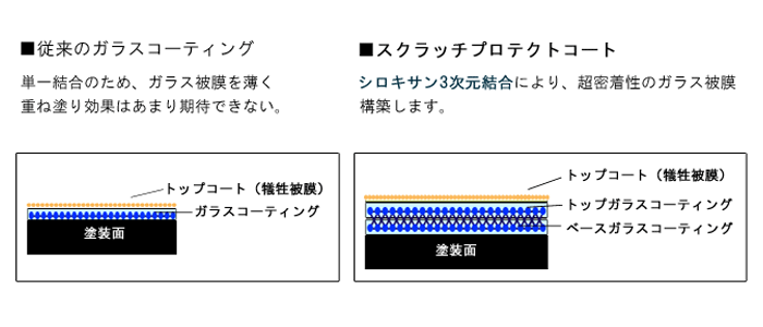 黒色の塗装は他の色に比べ汚れや傷が目立ちやすく、タオルで拭き上げるだけでこすり傷がはいってしまうほどデリケートです。新車以上の輝きは作るものの、「洗車のしやすさ」や「傷が付きにくい」と言った付加価値が薄れてしまっては「コーティング」の魅力が半減します。お客様が安心で快適にお手入れを楽しむことを目的と考えれば、従来のガラスコーティングのような、「一層極薄被膜」では高いパフォーマンスは期待できません。艶・撥水性能に加え、擦り傷などを防ぐ「耐スクラッチ性能」の向上を目的とした「高膜厚」・「複層ガラス被膜」などの新たな付加価値が求められています。
