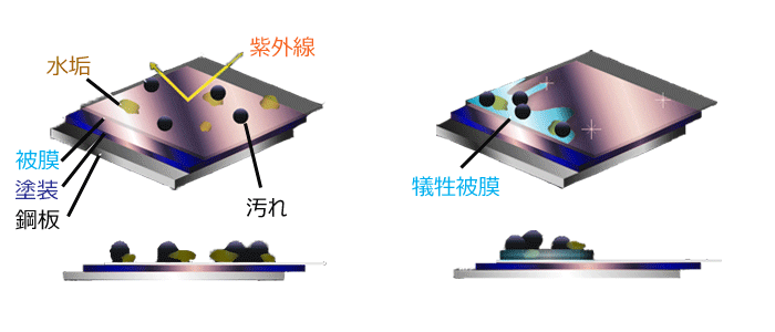 親水性(水になじみやすい)に水キレの良さを持たせた疎水性という被膜の特性は、極めて高い防汚効果を発揮します。さらに+αと位置付けるトップコートの性能は耐イオンデポジット(水シミ)性能の高め、「犠牲膜」としてと長期にわたり効果を発揮します。